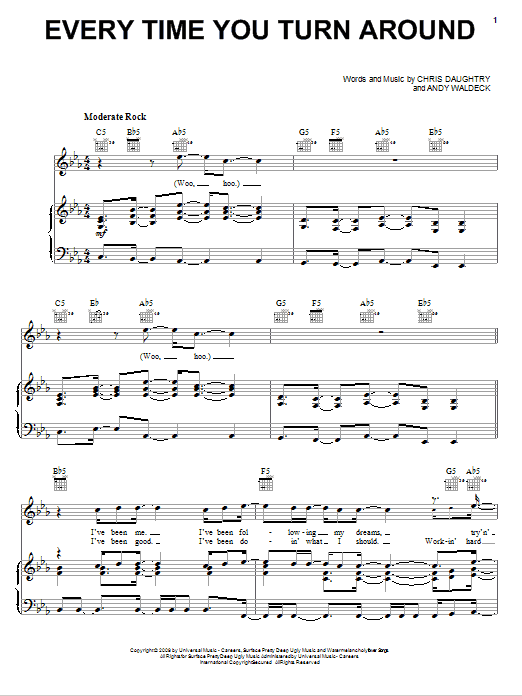 Download or print Daughtry Every Time You Turn Around sheet music, chords and digital score arranged for Piano, Vocal & Guitar Chords (Right-Hand Melody). This Pop score includes 7 page(s).