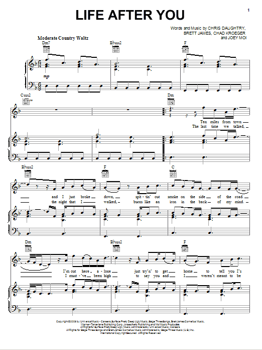 Download or print Daughtry Life After You sheet music, chords and digital score arranged for Piano, Vocal & Guitar Chords (Right-Hand Melody). This Pop score includes 5 page(s).