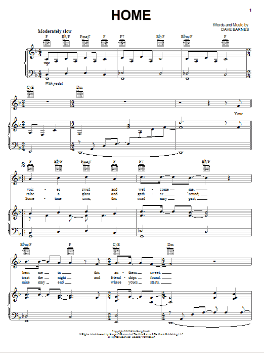 Download or print Dave Barnes Home sheet music, chords and digital score arranged for Piano, Vocal & Guitar Chords (Right-Hand Melody). This Pop score includes 4 page(s).