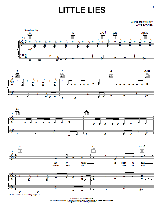 Download or print Dave Barnes Little Lies sheet music, chords and digital score arranged for Piano, Vocal & Guitar Chords (Right-Hand Melody). This Pop score includes 5 page(s).