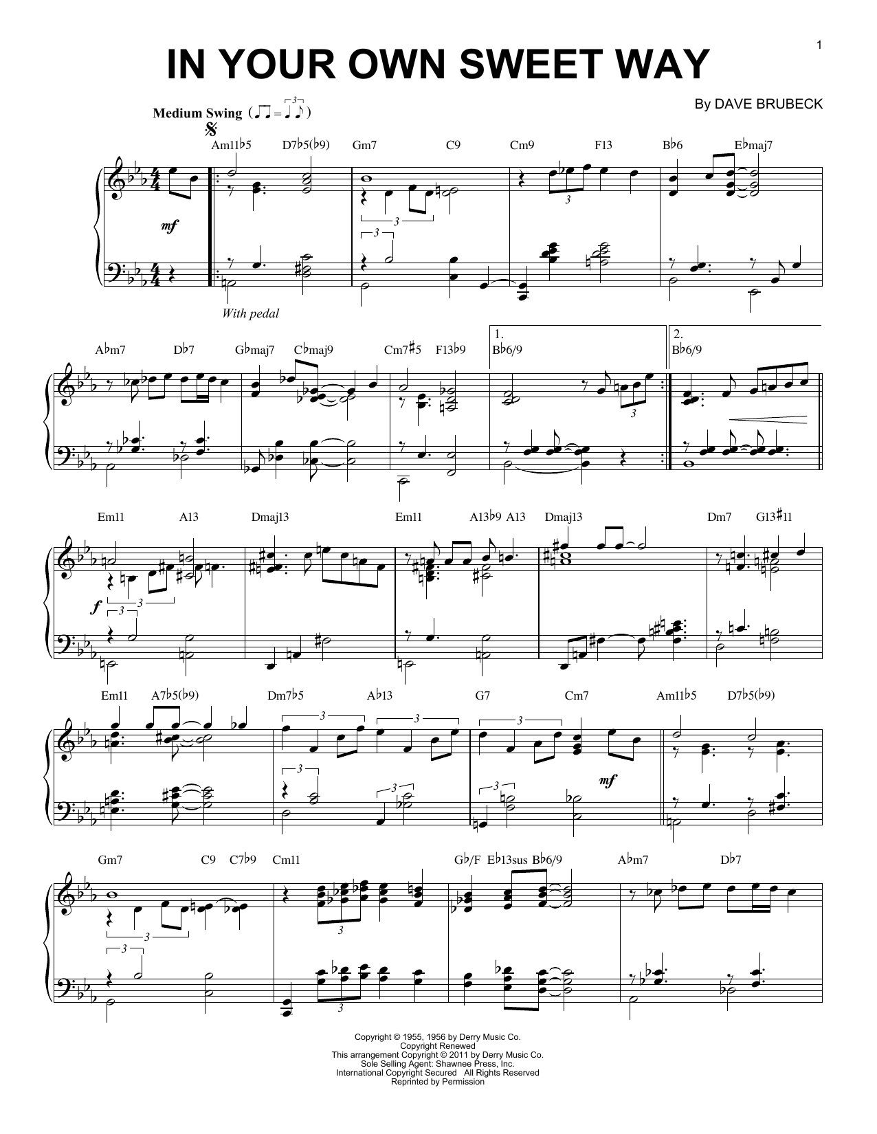 Download or print Dave Brubeck In Your Own Sweet Way (arr. Brent Edstrom) sheet music, chords and digital score arranged for Piano Solo. This Jazz score includes 3 page(s).
