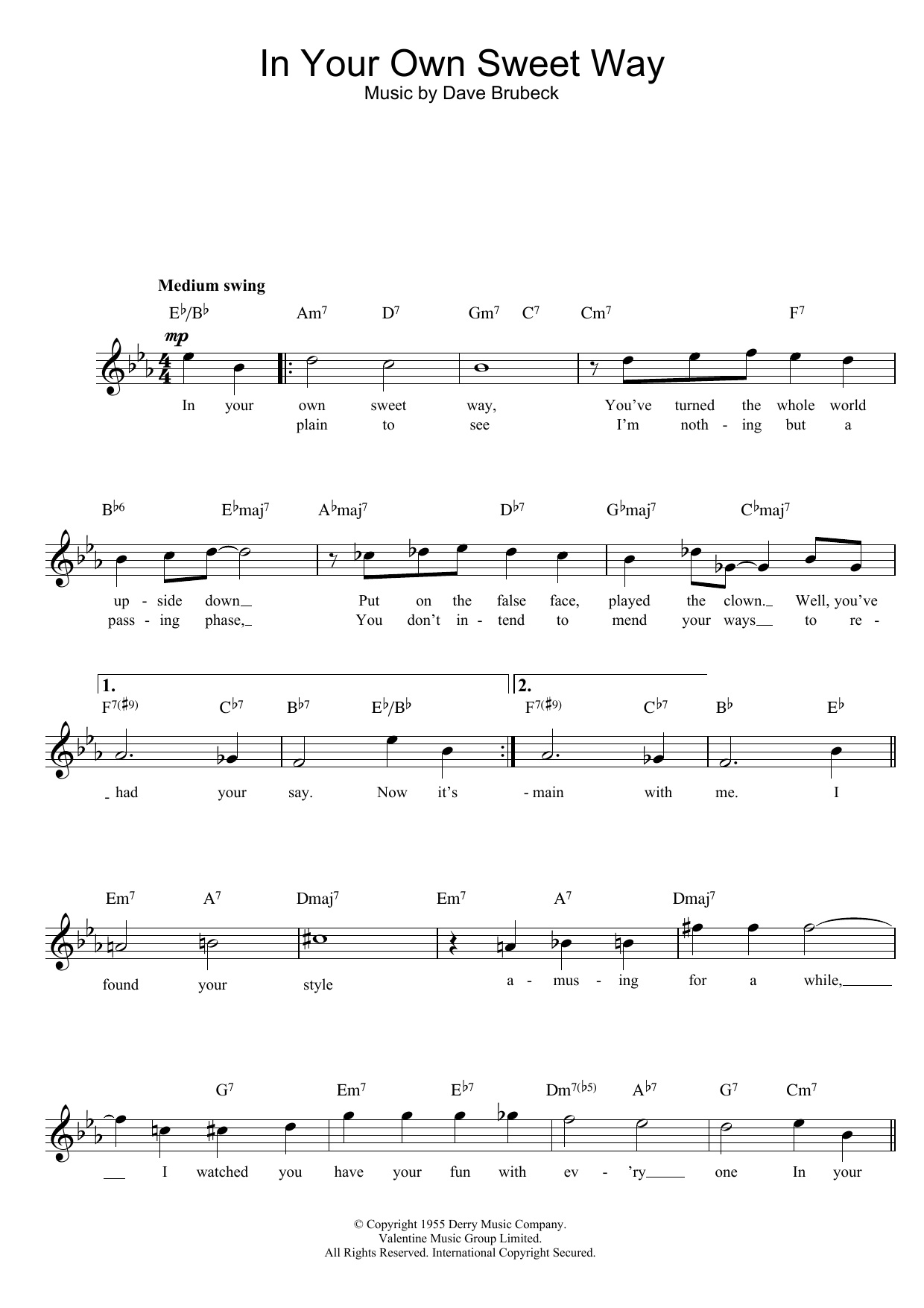 Download or print Dave Brubeck In Your Own Sweet Way sheet music, chords and digital score arranged for Piano Solo. This Jazz score includes 3 page(s).