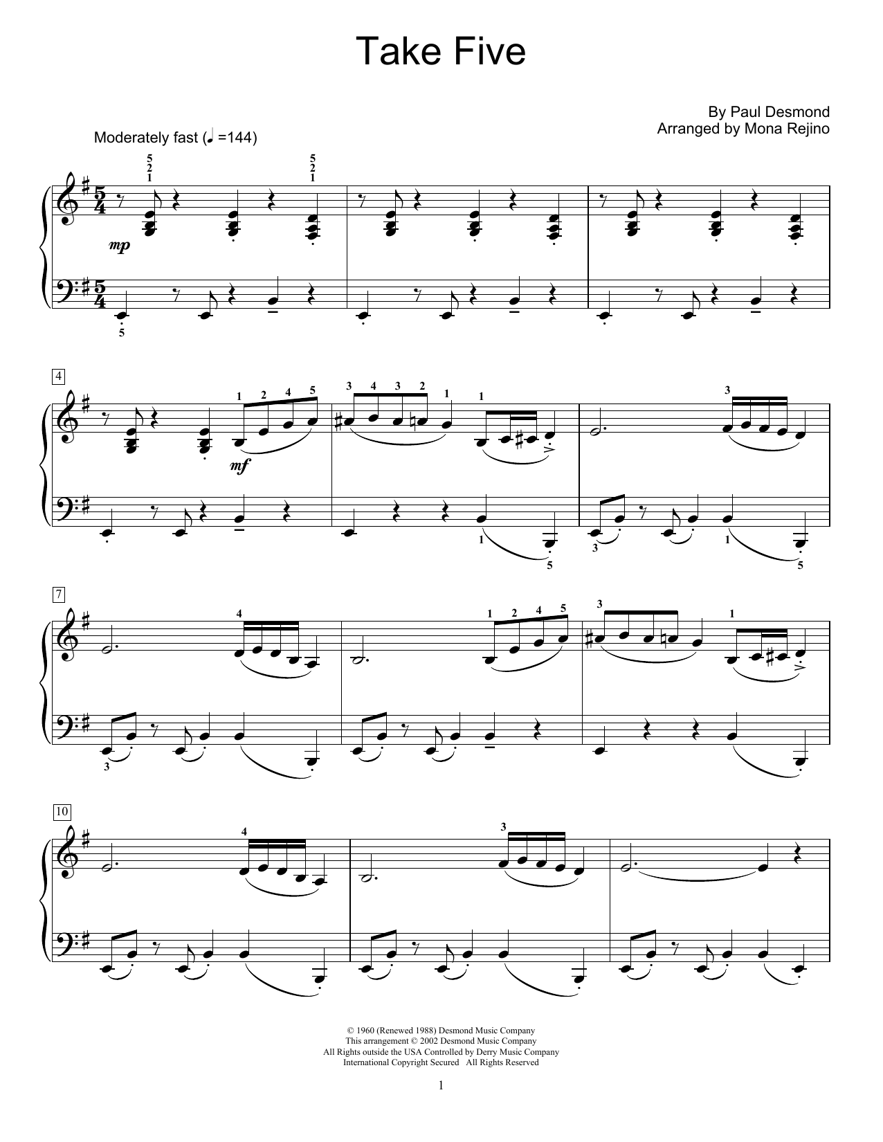 Quick facts Take Five (arr. Mona Rejino) about digital sheet music
