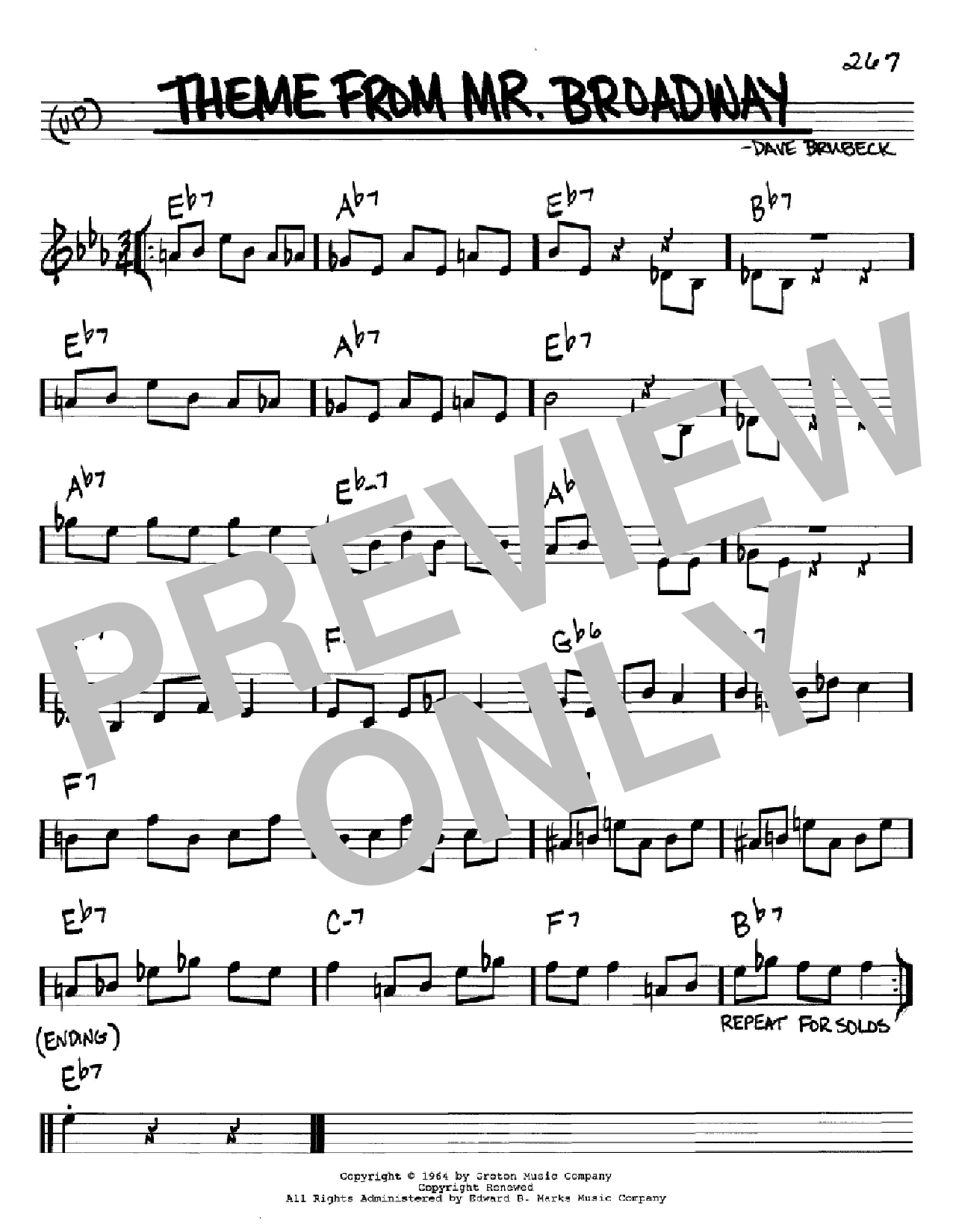 Download or print Dave Brubeck Theme From Mr. Broadway sheet music, chords and digital score arranged for Real Book – Melody & Chords – C Instruments. This Jazz score includes 1 page(s).