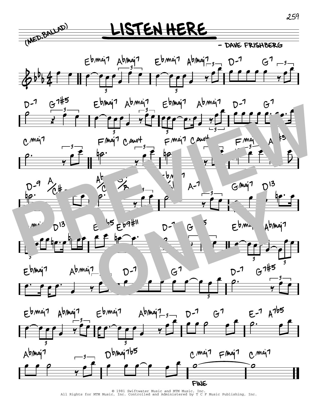Download or print Dave Frishberg Listen Here sheet music, chords and digital score arranged for Piano, Vocal & Guitar Chords (Right-Hand Melody). This Jazz score includes 4 page(s).