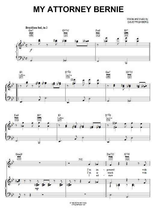 Download or print Dave Frishberg My Attorney Bernie sheet music, chords and digital score arranged for Piano, Vocal & Guitar Chords (Right-Hand Melody). This Jazz score includes 5 page(s).