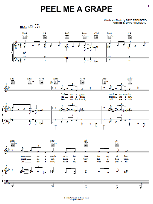 Download or print Dave Frishberg Peel Me A Grape sheet music, chords and digital score arranged for Real Book – Melody & Chords – C Instruments. This Jazz score includes 1 page(s).