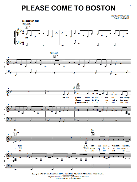 Download or print Dave Loggins Please Come To Boston sheet music, chords and digital score arranged for Piano, Vocal & Guitar Chords (Right-Hand Melody). This Country score includes 6 page(s).