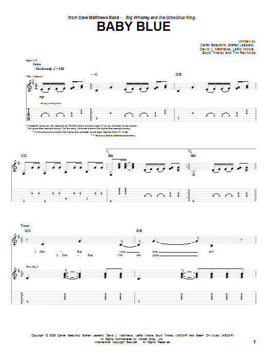 Download or print Dave Matthews Band Baby Blue sheet music, chords and digital score arranged for Guitar Tab. This Pop score includes 5 page(s).