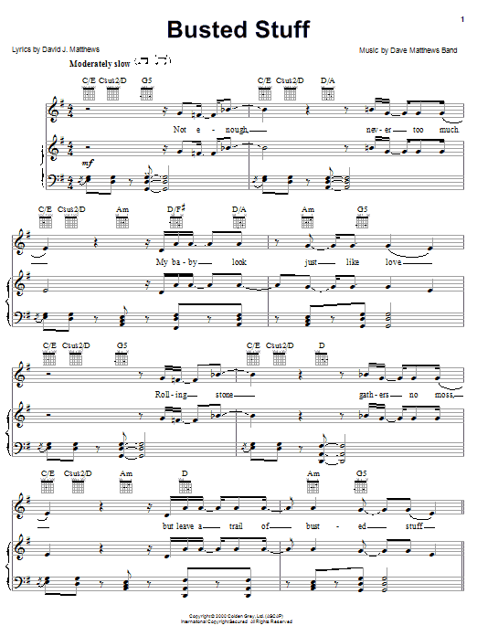 Download or print Dave Matthews Band Busted Stuff sheet music, chords and digital score arranged for Piano, Vocal & Guitar Chords (Right-Hand Melody). This Pop score includes 6 page(s).
