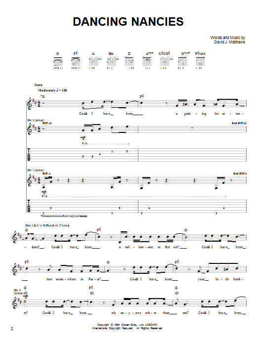 Download or print Dave Matthews Band Dancing Nancies sheet music, chords and digital score arranged for Bass Guitar Tab. This Pop score includes 10 page(s).