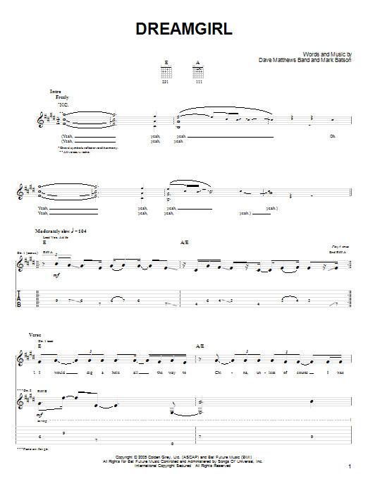 Download or print Dave Matthews Band Dreamgirl sheet music, chords and digital score arranged for Guitar Tab. This Pop score includes 6 page(s).