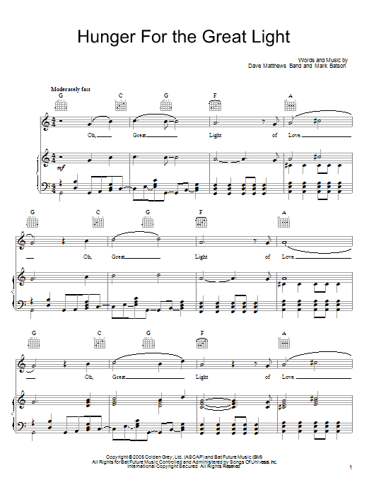 Download or print Dave Matthews Band Hunger For The Great Light sheet music, chords and digital score arranged for Piano, Vocal & Guitar Chords (Right-Hand Melody). This Pop score includes 7 page(s).