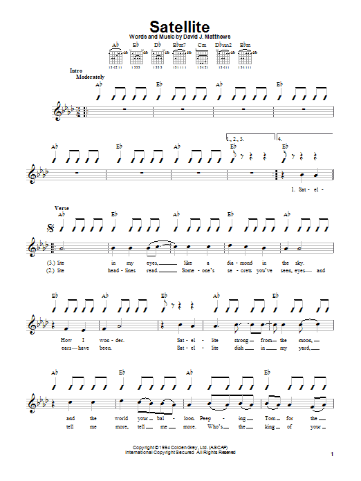 Download or print Dave Matthews Band Satellite sheet music, chords and digital score arranged for Piano, Vocal & Guitar Chords (Right-Hand Melody). This Pop score includes 5 page(s).