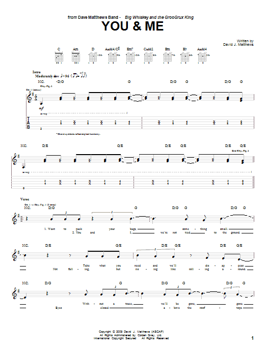 Download or print Dave Matthews Band You & Me sheet music, chords and digital score arranged for Piano, Vocal & Guitar Chords (Right-Hand Melody). This Love score includes 9 page(s).