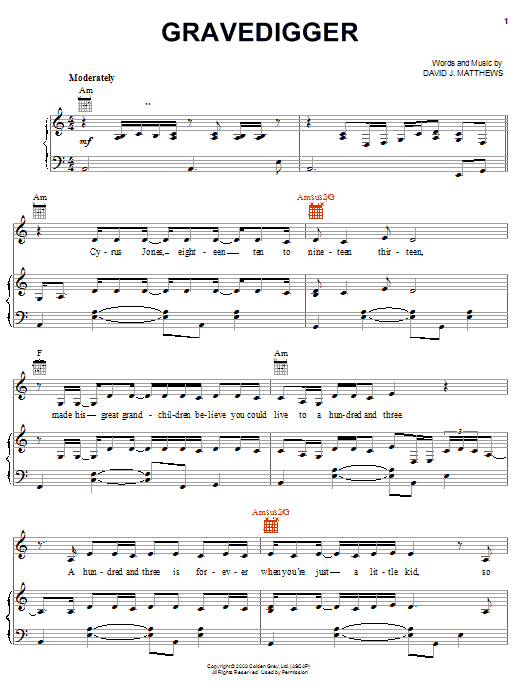 Download or print Dave Matthews Gravedigger sheet music, chords and digital score arranged for Piano, Vocal & Guitar Chords (Right-Hand Melody). This Pop score includes 9 page(s).