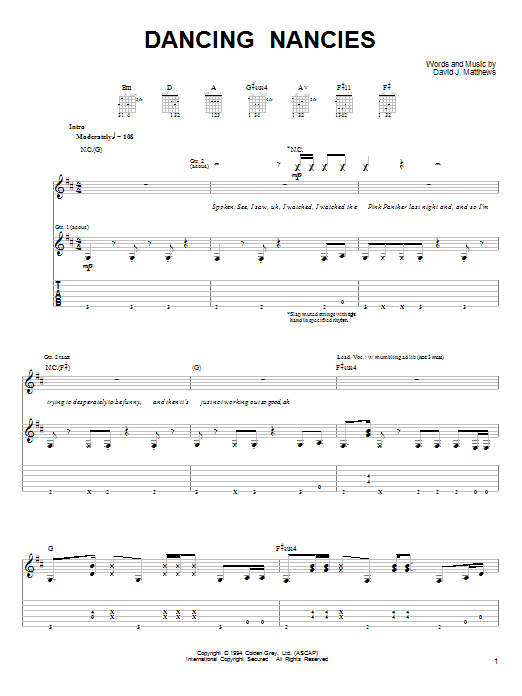 Download or print Dave Matthews & Tim Reynolds Dancing Nancies sheet music, chords and digital score arranged for Guitar Tab. This Pop score includes 25 page(s).