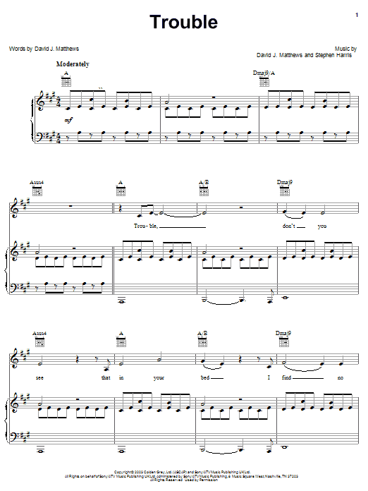 Download or print Dave Matthews Trouble sheet music, chords and digital score arranged for Piano, Vocal & Guitar Chords (Right-Hand Melody). This Pop score includes 7 page(s).