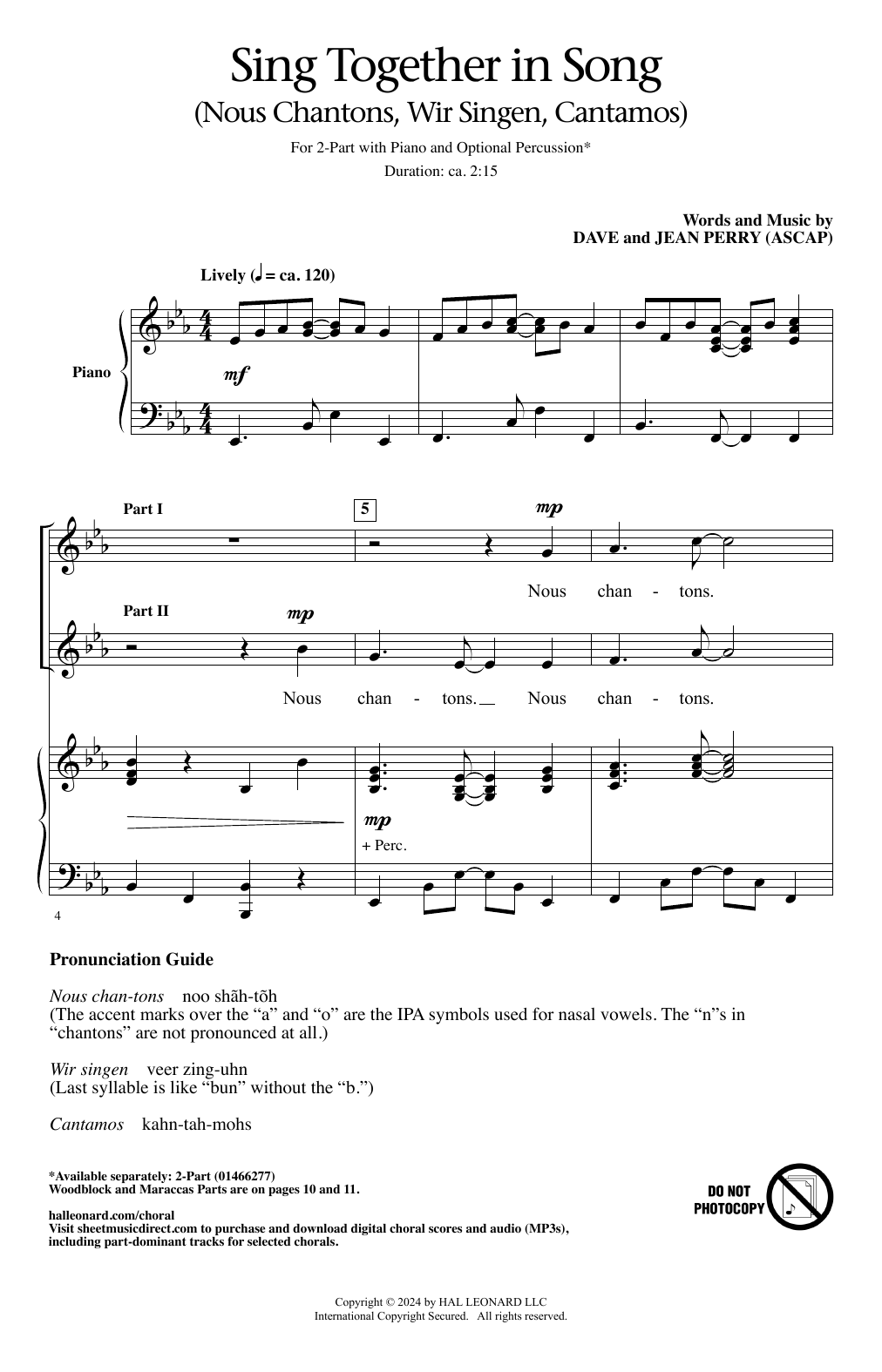 Download or print Dave Perry & Jean Perry Sing Together In Song (Nous Chantons, Wir Singen, Cantamos) sheet music, chords and digital score arranged for 2-Part Choir. This Concert score includes 10 page(s).