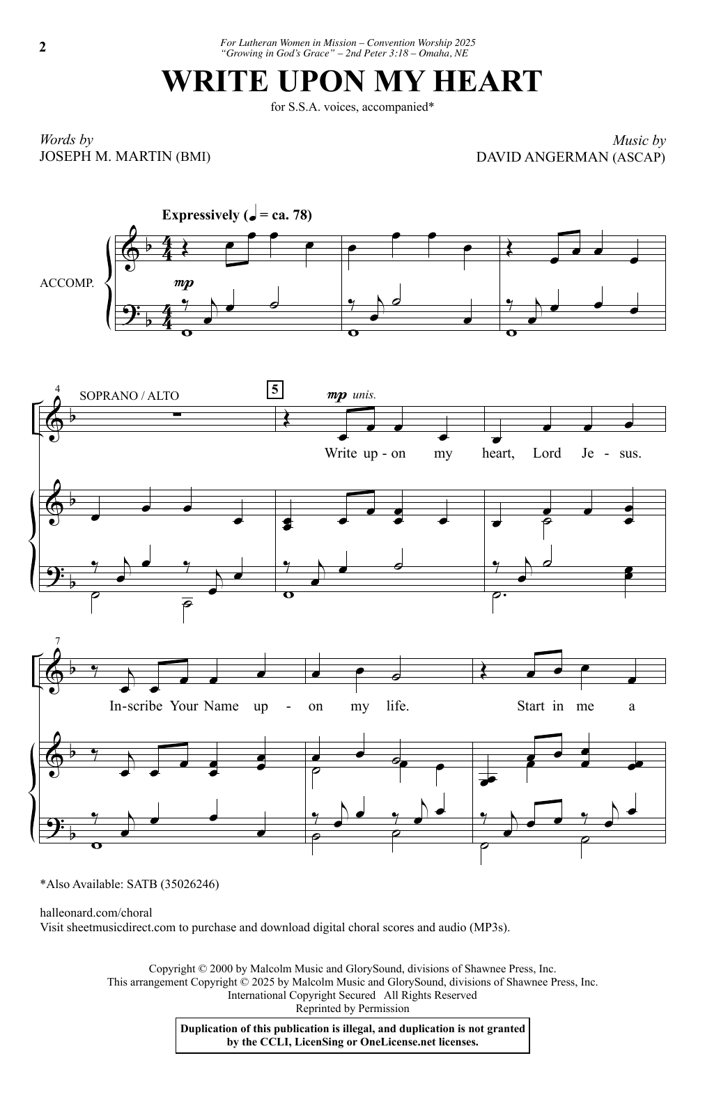 Download or print David Angerman Write Upon My Heart sheet music, chords and digital score arranged for SSA Choir. This Concert score includes 7 page(s).