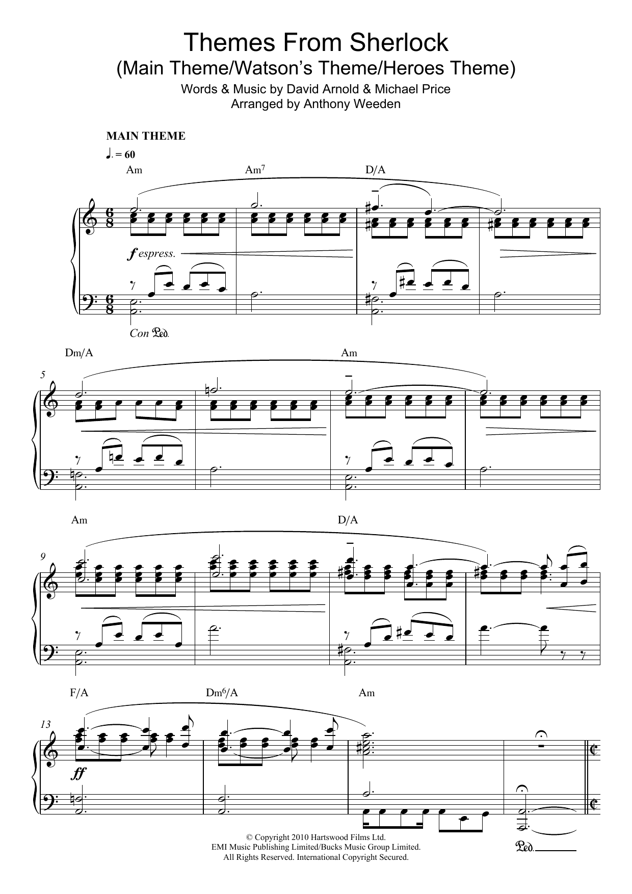Download or print David Arnold Themes From Sherlock (Main Theme/Watson's Theme/Heroes Theme) sheet music, chords and digital score arranged for Piano Solo. This Film/TV score includes 4 page(s).