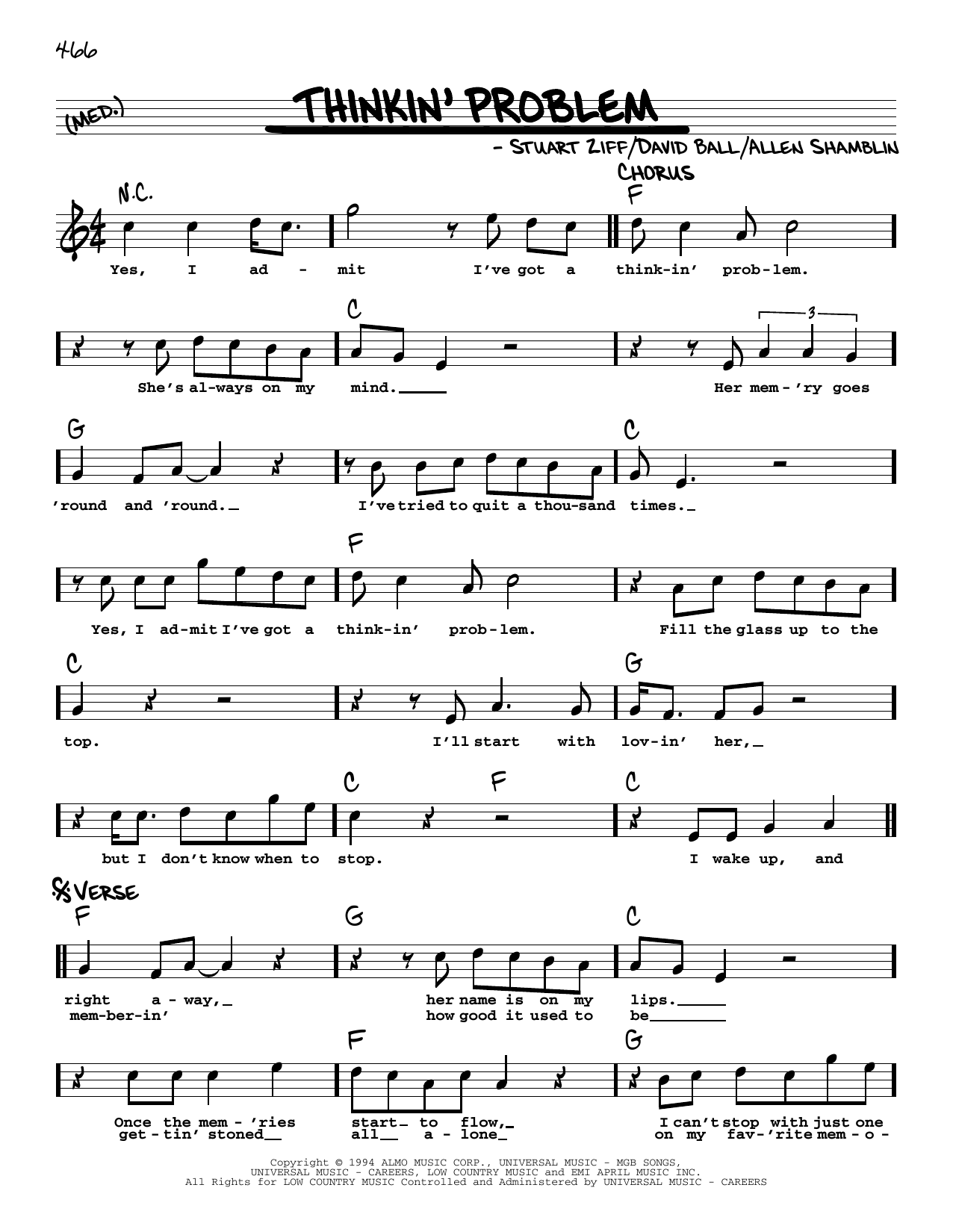 Download or print David Ball Thinkin' Problem sheet music, chords and digital score arranged for Piano, Vocal & Guitar Chords (Right-Hand Melody). This Country score includes 5 page(s).