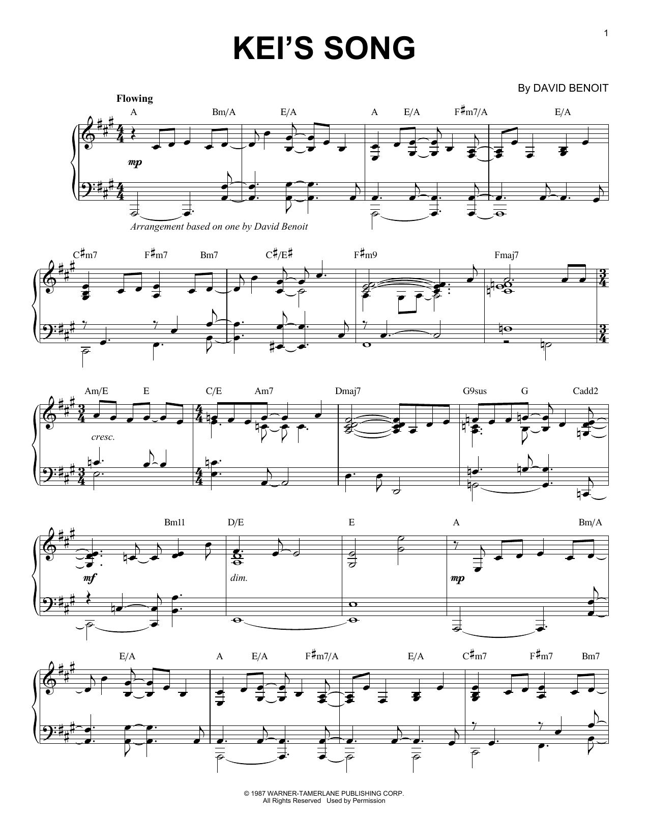 Download or print David Benoit Kei's Song sheet music, chords and digital score arranged for Piano Solo. This Jazz score includes 5 page(s).