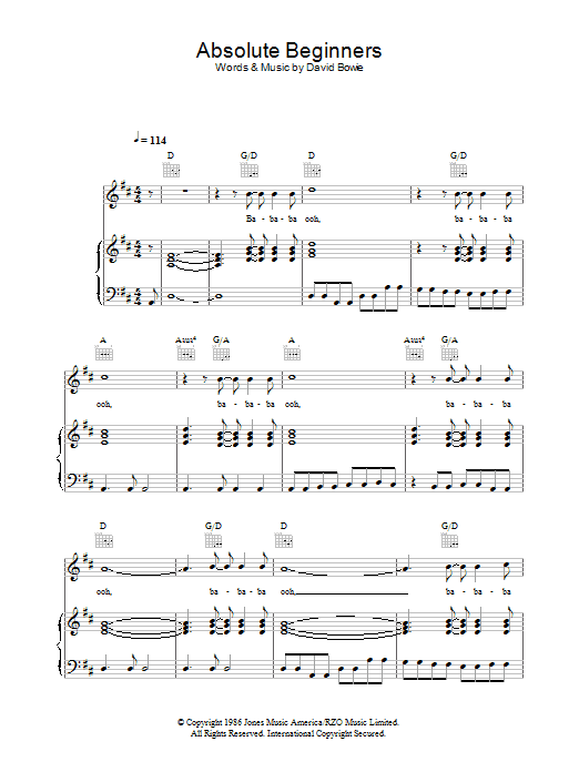 Download or print David Bowie Absolute Beginners sheet music, chords and digital score arranged for Guitar Chords/Lyrics. This Rock score includes 3 page(s).
