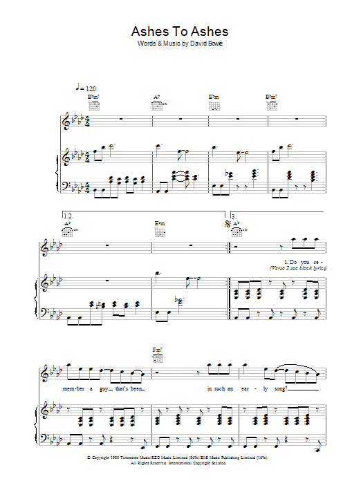 Download or print David Bowie Ashes To Ashes sheet music, chords and digital score arranged for Piano, Vocal & Guitar Chords (Right-Hand Melody). This Pop score includes 7 page(s).