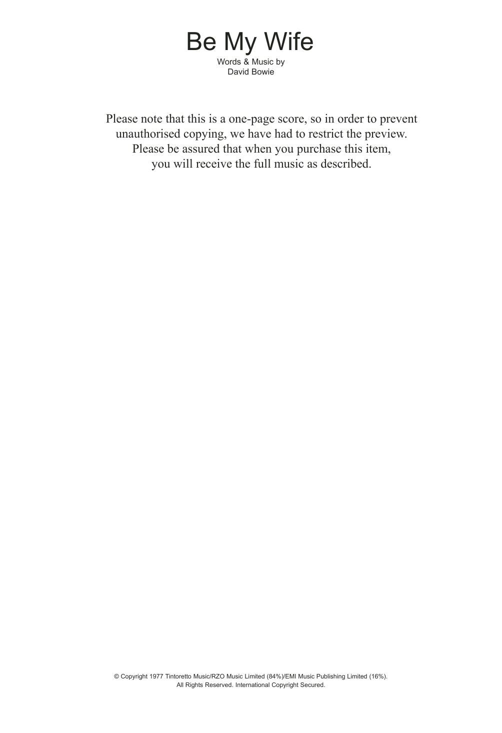 Download or print David Bowie Be My Wife sheet music, chords and digital score arranged for Guitar Chords/Lyrics. This Rock score includes 2 page(s).