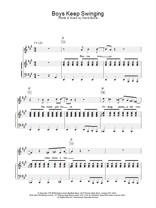 Download or print David Bowie Boys Keep Swinging sheet music, chords and digital score arranged for Guitar Chords/Lyrics. This Rock score includes 2 page(s).