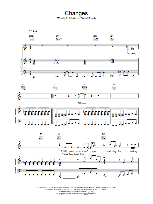 Download or print David Bowie Changes sheet music, chords and digital score arranged for Piano, Vocal & Guitar Chords. This Pop score includes 2 page(s).