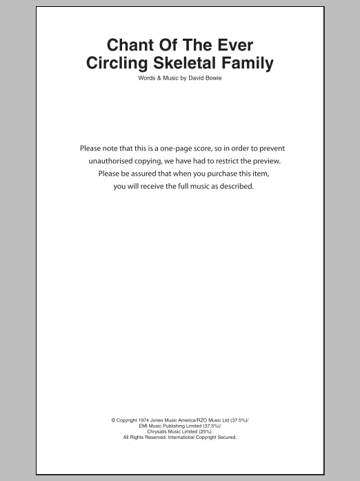 Download or print David Bowie Chant Of The Ever Circling Skeletal Family sheet music, chords and digital score arranged for Guitar Chords/Lyrics. This Rock score includes 2 page(s).
