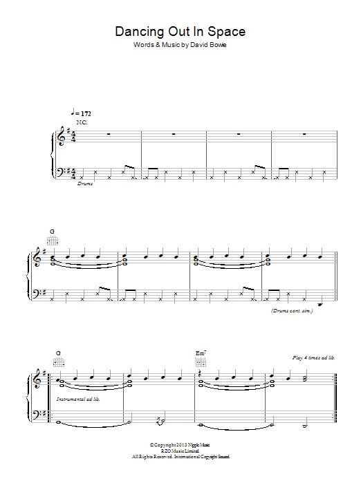 Download or print David Bowie Dancing Out In Space sheet music, chords and digital score arranged for Piano, Vocal & Guitar Chords. This Alternative score includes 5 page(s).