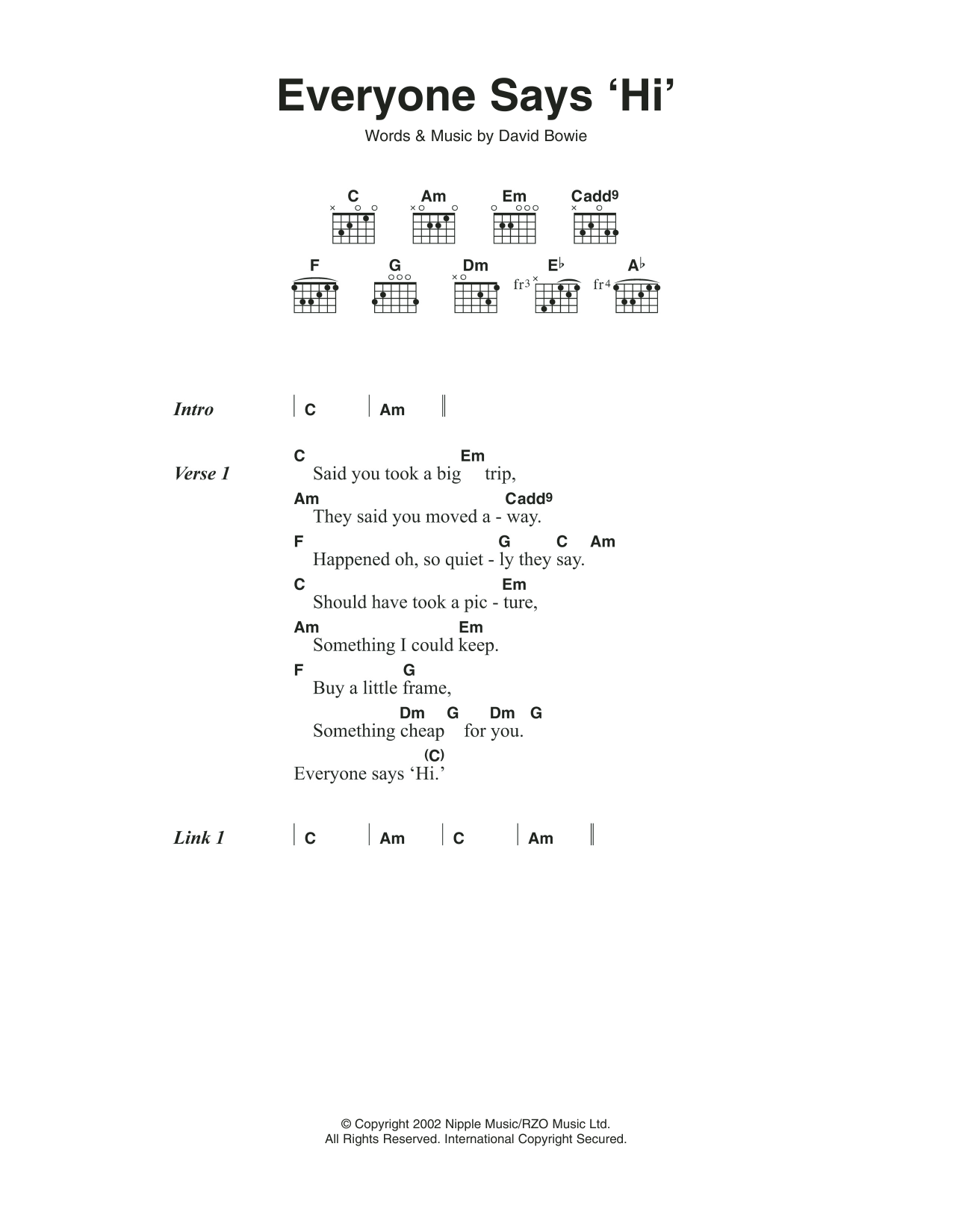 Download or print David Bowie Everyone Says "hi" sheet music, chords and digital score arranged for Guitar Chords/Lyrics. This Rock score includes 3 page(s).