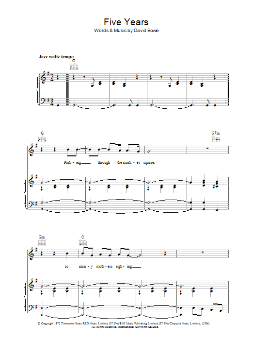 Download or print David Bowie Five Years sheet music, chords and digital score arranged for Piano, Vocal & Guitar Chords. This Pop score includes 12 page(s).