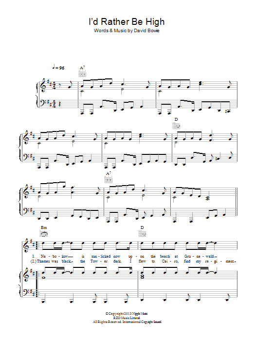 Download or print David Bowie I'd Rather Be High sheet music, chords and digital score arranged for Piano, Vocal & Guitar Chords. This Alternative score includes 5 page(s).