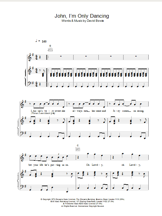 Download or print David Bowie John, I'm Only Dancing sheet music, chords and digital score arranged for Guitar Chords/Lyrics. This Rock score includes 2 page(s).