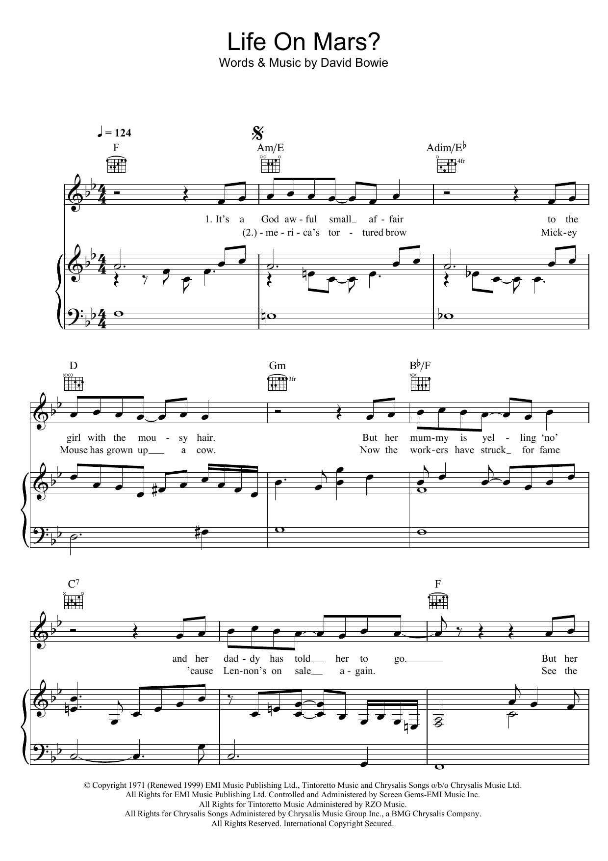 Download or print David Bowie Life On Mars? sheet music, chords and digital score arranged for Ukulele Chords/Lyrics. This Pop score includes 3 page(s).