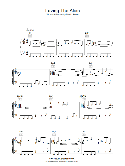 Download or print David Bowie Loving The Alien sheet music, chords and digital score arranged for Guitar Chords/Lyrics. This Rock score includes 3 page(s).