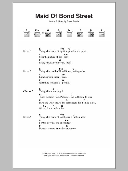 Download or print David Bowie Maid Of Bond Street sheet music, chords and digital score arranged for Guitar Chords/Lyrics. This Rock score includes 2 page(s).