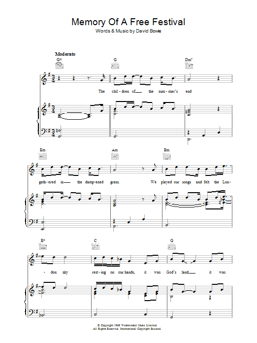 Download or print David Bowie Memory Of A Free Festival sheet music, chords and digital score arranged for Piano, Vocal & Guitar Chords. This Pop score includes 7 page(s).