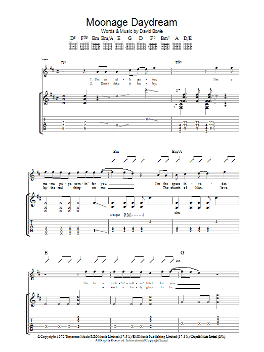 Download or print David Bowie Moonage Daydream sheet music, chords and digital score arranged for Guitar Chords/Lyrics. This Rock score includes 2 page(s).