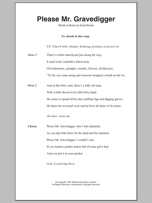 Download or print David Bowie Please Mr. Gravedigger sheet music, chords and digital score arranged for Guitar Chords/Lyrics. This Rock score includes 2 page(s).