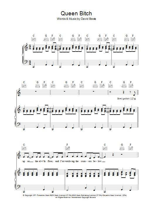 Download or print David Bowie Queen Bitch sheet music, chords and digital score arranged for Guitar Chords/Lyrics. This Rock score includes 3 page(s).
