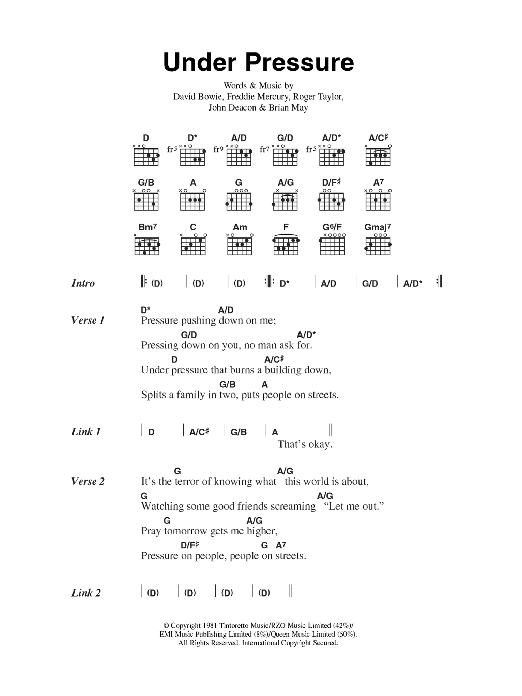 Download or print David Bowie Under Pressure sheet music, chords and digital score arranged for Piano, Vocal & Guitar Chords (Right-Hand Melody). This Pop score includes 8 page(s).