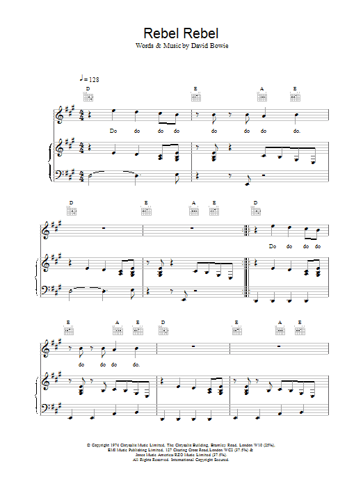 Download or print David Bowie Rebel Rebel sheet music, chords and digital score arranged for Guitar Chords/Lyrics. This Rock score includes 3 page(s).