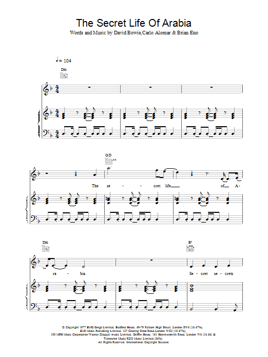 Download or print David Bowie The Secret Life Of Arabia sheet music, chords and digital score arranged for Guitar Chords/Lyrics. This Rock score includes 2 page(s).