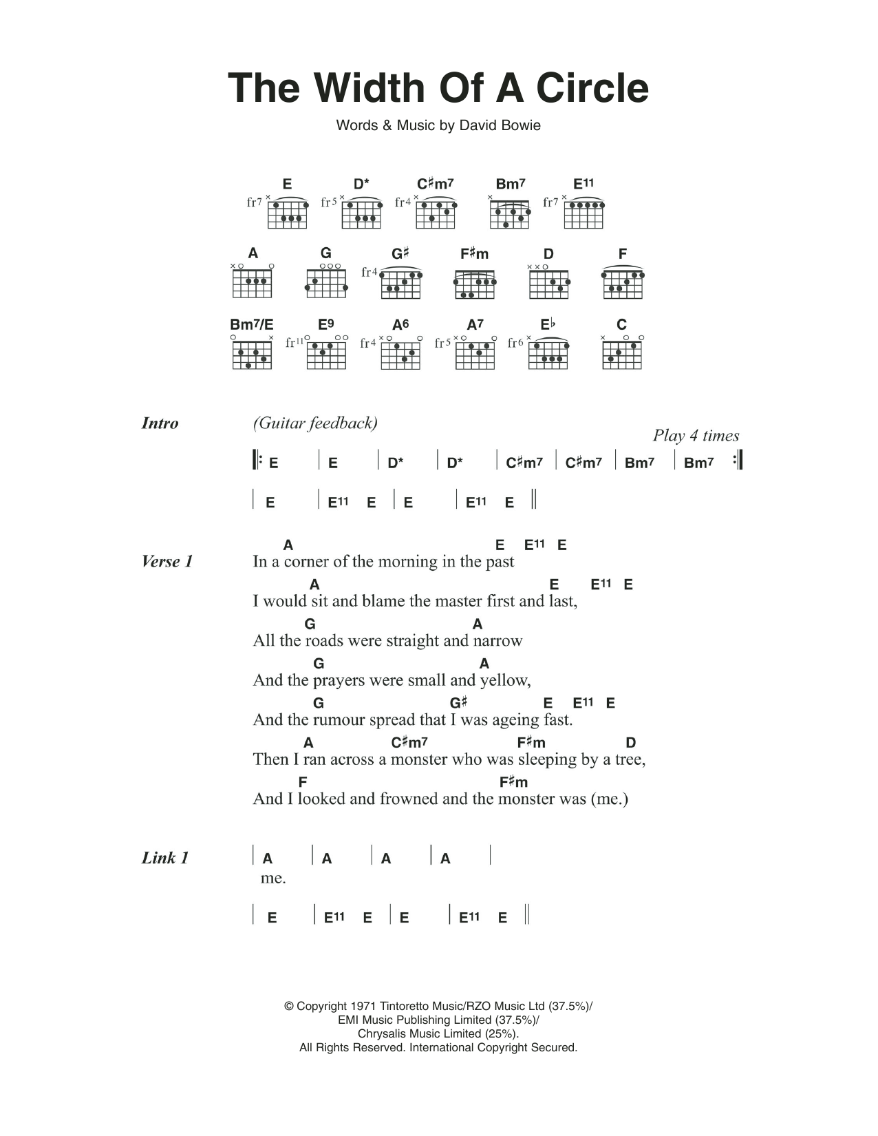 Download or print David Bowie The Width Of A Circle sheet music, chords and digital score arranged for Guitar Chords/Lyrics. This Rock score includes 3 page(s).