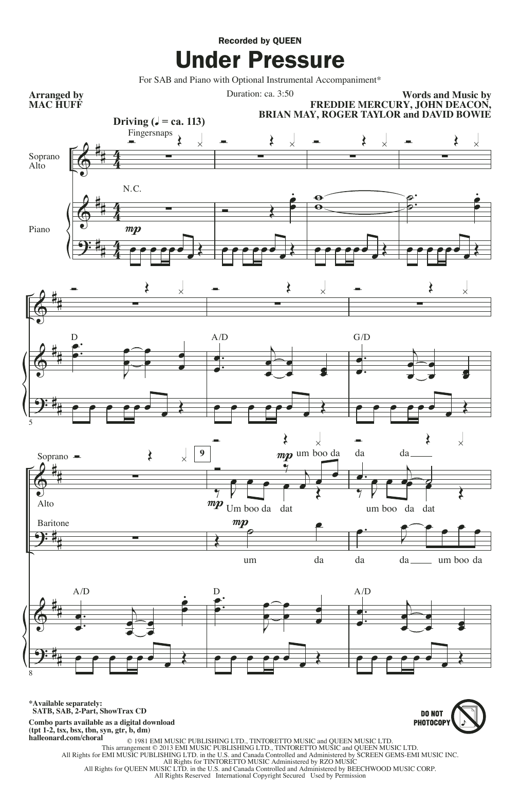 Download or print Queen & David Bowie Under Pressure (arr. Mac Huff) sheet music, chords and digital score arranged for SATB Choir. This Pop score includes 11 page(s).